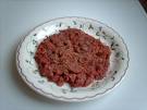 - 800 - 900g de viande de boeuf (ça dépend des mangeurs. Je compte 200g env. par personne). Vous pouvez demander à votre boucher de vous couper la viande façon tartare ou vous pouvez la couper vous-même au couteau (c'est du boulot !)